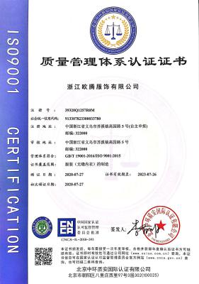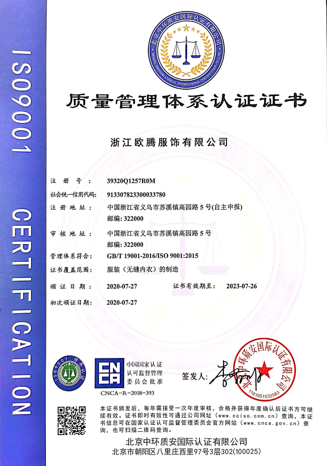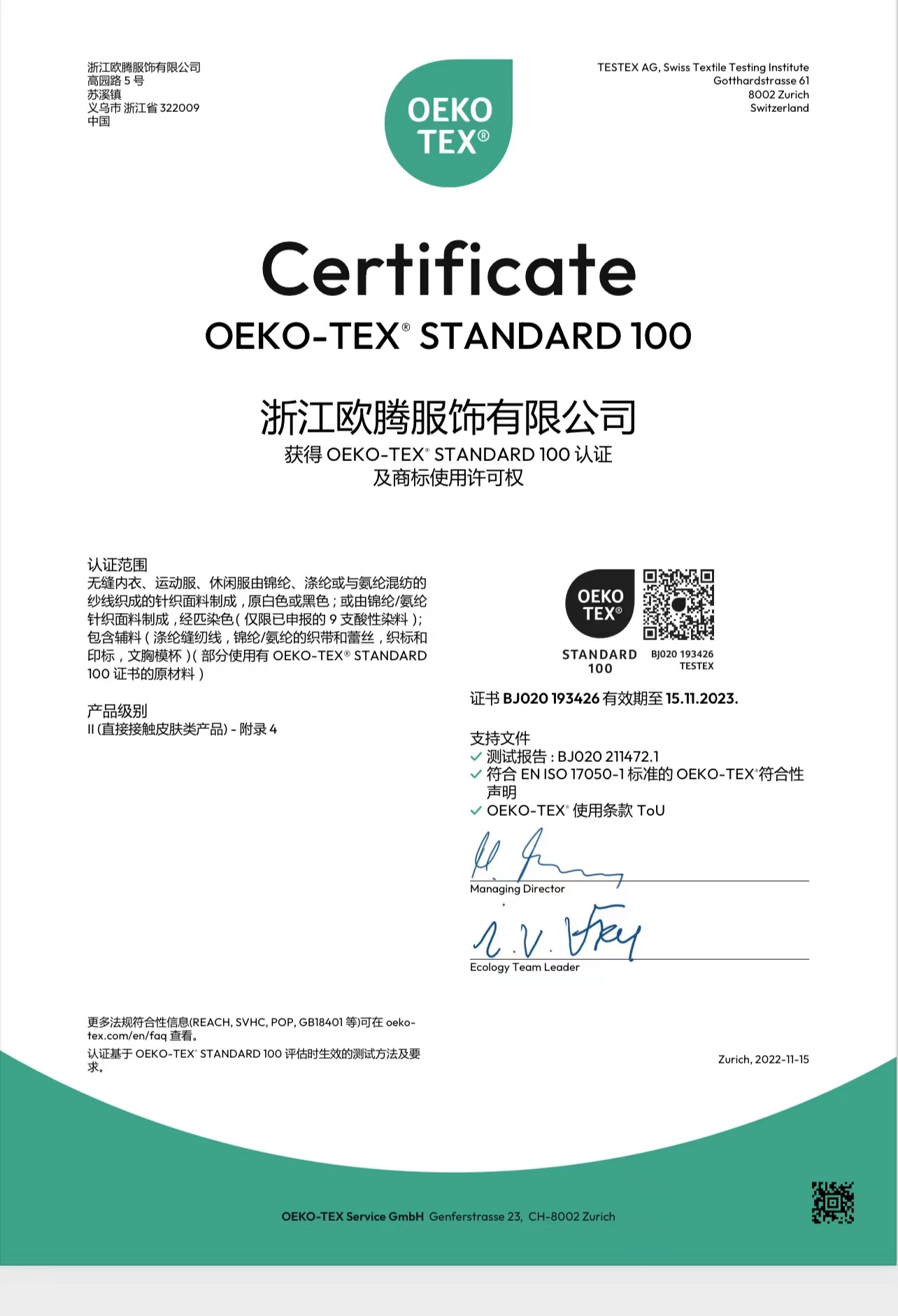 浙江歐騰服飾有限公司位于世界小商品之都-義烏。創(chuàng)立于2015年,是一家專業(yè)生產(chǎn)無縫針織運(yùn)動服飾和內(nèi)衣的工貿(mào)一體企業(yè),擁有自主出口權(quán)。 工廠的占地面積約16000平方米 ,引進(jìn)了大型圣東尼、高騰等多種先進(jìn)的制衣設(shè)備300余臺。月產(chǎn)能可達(dá)90萬件。 歐騰服飾每年投入近百萬資金打樣開發(fā)新產(chǎn)品,有著一支高素質(zhì)設(shè)計、技術(shù)員工隊伍。工廠先后通過了ISO 9001質(zhì)量管理體系認(rèn)證、BSCI認(rèn)證、GRS認(rèn)證、OEKO-TEX國際生態(tài)紡織品認(rèn)證等多項專利檢測報告??商峁㎡EM&ODM服務(wù)。歐騰服飾以一套完整、科學(xué)的質(zhì)量管理體系,生產(chǎn)的服裝從原材料紗線到成衣,質(zhì)量完全能夠滿足國內(nèi)、國際質(zhì)量要求。獲得了客戶一致好評。工廠先后獲得省科技型企業(yè)、國家高新企業(yè)、義烏市誠信講信用單位、規(guī)上企業(yè)、信用AAA級等榮譽(yù)。